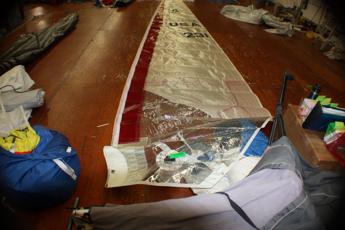 Used Sail Mainsail 49468 - Masthead Sailing Gear and Atlantic Sail Traders has 1000s of Used and New Sails in stock. Main Headsail and spinnaker all sizes.Catmaran mainsail with 8 full length batten pockets. Battens not included. Some delamination. Sail number USA 231 and a blue sail bag.